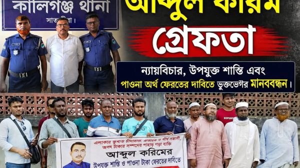 সাতক্ষীরায় কথিত চাঁদাবাজ ও প্রতারক আব্দুল করিমের বিরুদ্ধে মানববন্ধন ও বিক্ষোভ