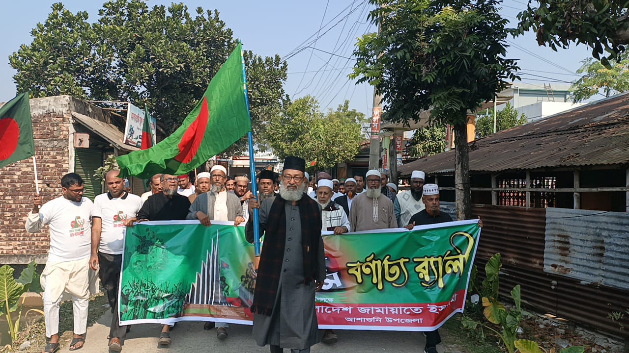র্যালি করা হয়।জাতীয় পতাকা,রংবেরঙের শো পতাকা ও টি-শার্ট পরিহিত হাজার হাজার নেতাকর্মীর উপস্থিতিতে র্যালিটি উপজেলা জামায়াত কার্যালয় থেকে শুরু হয়ে বিভিন্ন সড়ক প্রদক্ষিণ করে আশাশুনি সরকারি হাই স্কুল মাঠে উপজেলা প্রশাসন আয়োজিত অনুষ্ঠানে যোগদান করে। র্যালিতে নেতৃত্বদেন সাতক্ষীরা-৩ (কালিগঞ্জ-আশাশুনি) আসনের জামায়াত মনোনীত সংসদ সদস্য প্রার্থী, কেন্দ্রীয় শুরা সদস্য,খুলনা অঞ্চল টিম সদস্য ও সাবেক জেলা আমীর মুহাদ্দিস রবিউল বাশার।