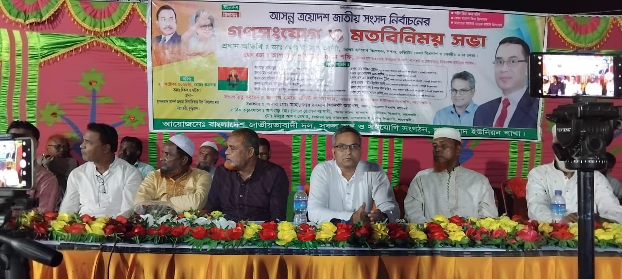 প্রধান অতিথি : মাটি ও মানুষের নেতা ডা: মোঃ ইউনুস আলী, হৃদরোগ বিশেষজ্ঞ, সদস্য কুড়িগ্রাম জেলা বিএনপি ও কেন্দ্রীয় ড্যাব নেতা এবং ২৫ কুড়িগ্রাম ১ আসনে মনোনয়ন প্রত্যাশী। প্রধান বক্তা :আলহাজ্ব শফিউল আলম শফি সিনিয়র যুগ্ন আহবায়ক উপজেলা বিএনপি নাগেশ্বরী ও চেয়ারম্যান ভিতরবন্দ ইউনিয়ন পরিষদ। বিশেষ অতিথি :আলহাজ্ব মোখলেছুর রহমান, সদস্য সচিব উপজেলা বিএনপি নাগেশ্বরী, জনাব মোঃ ওমর ফারুক, সিনিয়র যুগ্ন আহবায়ক পৌর বিএনপি নাগেশ্বরী, জনাব মোঃ শহিদুল ইসলাম সরকার, যুগ্ন আহবায়ক উপজেলা বিএনপি নাগেশ্বরী,জনাব এ কে এম আশরাফ হোসেন আপেল যুগ্ন আহবায়ক পৌর বিএনপি নাগেশ্বরী, জনাব মোঃ মোজাম্মেল হক দুদু, যুগ্ন -আহবায়ক বাংলাদেশ জাতীয়তাবাদী দল বিএনপি নাগেশ্বরী উপজেলা শাখা, জনাব মোঃ নাজির হোসেন যুগ্ন আহবায়ক নাগেশ্বরী বিএনপি, গণসংযোগ ও মতবিনিময় সভায় ডঃ মুহাম্মদ ইউনুস আলী বলেন দেশ ও সমাজের উন্নয়নে এবং জনগণের পাশে থাকার মত প্রকাশ করেন এবং দেশ উন্নয়নে তারুণ্যের অহংকার তারেক রহমানের প্রতিশ্রুতি ৩১ দফা দাবি বাস্তবায়নে নিজেকে উজ্জীবিত করেন। উক্ত মতবিনিময় সভায় দলের সকল অঙ্গ সংগঠনের নেতাকর্মী উপস্থিত ছিল। সভাপতিত্ব করেন :জনাব মোঃ রবিউল আলম, আহবায়ক হাসনাবাদ ইউনিয়ন বিএনপি নাগেশ্বরী। সঞ্চালনায় :জনাব মোঃ মাহফুজার রহমান সিদ্দিকী আপেল সদস্য উপজেলা বিএনপি, নাগেশ্বরী। সার্বিক তত্ত্বাবধানে :আলহাজ্ব মোঃ বেলাল হোসেন ব্যাপারি সদস্য সচিব হাসনাবাদ ইউনিয়ন বিএনপি, নাগেশ্বরী। আয়োজনে :বাংলাদেশ জাতীয়তাবাদী দল ও সকল অঙ্গ সহযোগী সংগঠন হাসনাবাদ ইউনিয়ন শাখা, নাগেশ্বরী, কুড়িগ্রাম।।
