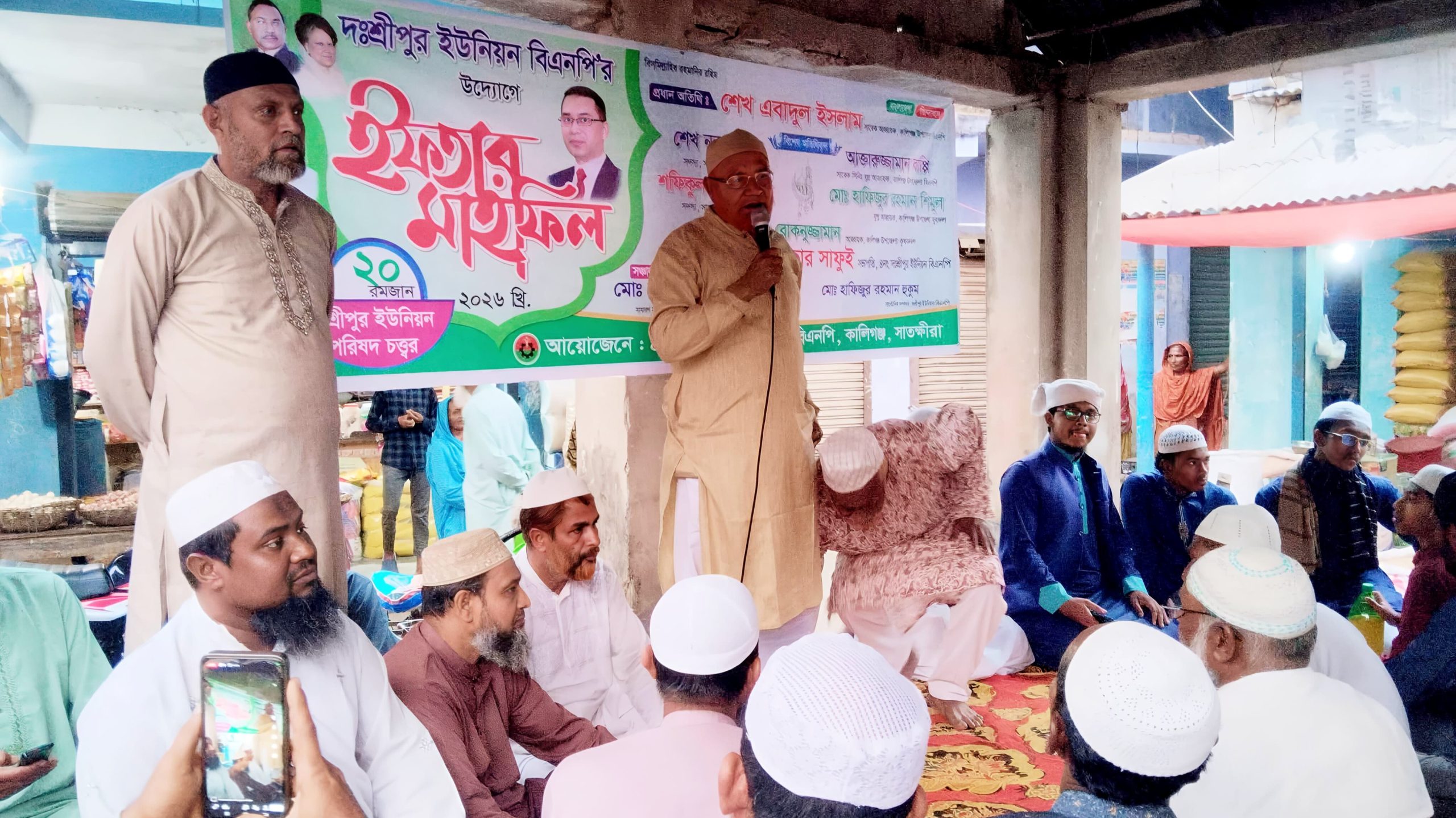 পবিত্র মাহে রমজান উপলক্ষে সাতক্ষীরার কালিগঞ্জ উপজেলার ৪নং দক্ষিণ শ্রীপুর ইউনিয়ন বিএনপি’র উদ্যোগে ইফতার মাহফিল অনুষ্ঠিত হয়েছে। রমজানের ২০তম দিনে, মঙ্গলবার (১০ মার্চ) দক্ষিণ শ্রীপুর বাজার চত্বরে আয়োজিত এ ইফতার মাহফিলে বিএনপি ও এর অঙ্গসংগঠনের বিভিন্ন পর্যায়ের নেতাকর্মীসহ স্থানীয় গণ্যমান্য ব্যক্তিবর্গ অংশগ্রহণ করেন। অনুষ্ঠানে সভাপতিত্ব করেন ৪নং দক্ষিণ শ্রীপুর ইউনিয়ন বিএনপি’র সভাপতি মোঃ জুলফিকার আলী এবং সঞ্চালনা করেন মোঃ নূরুজ্জামান পাড়।অনুষ্ঠানে প্রধান অতিথি হিসেবে উপস্থিত ছিলেন কালিগঞ্জ উপজেলা বিএনপির সাবেক আহ্বায়ক ও জেলা বিএনপির সদস্য শেখ এবাদুল ইসলাম। বিশেষ অতিথি হিসেবে বক্তব্য রাখেন সাতক্ষীরা জেলা বিএনপির নেতা শেখ নুরুজ্জামান, কালিগঞ্জ উপজেলা যুবদলের যুগ্ম আহ্বায়ক এম হাফিজুর রহমান শিমুল,উপজেলা জামায়াতে ইসলামীর কর্মপরিষদের সদস্য মাওলানা সালাউদ্দিন এবং দক্ষিণ শ্রীপুর ইউনিয়ন বিএনপির সাংগঠনিক সম্পাদক মোঃ হাফিজুর রহমান হুকুম।এসময় ইউনিয়ন ও ওয়ার্ড বিএনপি, জামায়াতে ইসলামী এবং সহযোগী সংগঠনের নেতৃবৃন্দ উপস্থিত ছিলেন।বক্তারা বলেন,পবিত্র মাহে রমজান আত্মশুদ্ধি, সংযম, সহমর্মিতা ও ভ্রাতৃত্ববোধের শিক্ষা দেয়। এই পবিত্র মাসে সমাজে পারস্পরিক সম্প্রীতি, মানবিকতা ও সৌহার্দ্য আরও সুদৃঢ় করতে সবাইকে ঐক্যবদ্ধভাবে কাজ করার আহ্বান জানান তারা। একই সঙ্গে দেশের গণতন্ত্র, ন্যায়বিচার ও মানুষের মৌলিক অধিকার প্রতিষ্ঠায় সকলকে ঐক্যবদ্ধ থাকার ওপর গুরুত্বারোপ করেন বক্তারা।অনুষ্ঠান শেষে দেশ, জাতি ও মুসলিম উম্মাহর কল্যাণ কামনা করে বিশেষ দোয়া ও মোনাজাত পরিচালনা করা হয়। ইফতার মাহফিলে স্থানীয় বিএনপি ও অঙ্গসংগঠনের বিপুল সংখ্যক নেতাকর্মী এবং সাধারণ মানুষ উপস্থিত ছিলেন।