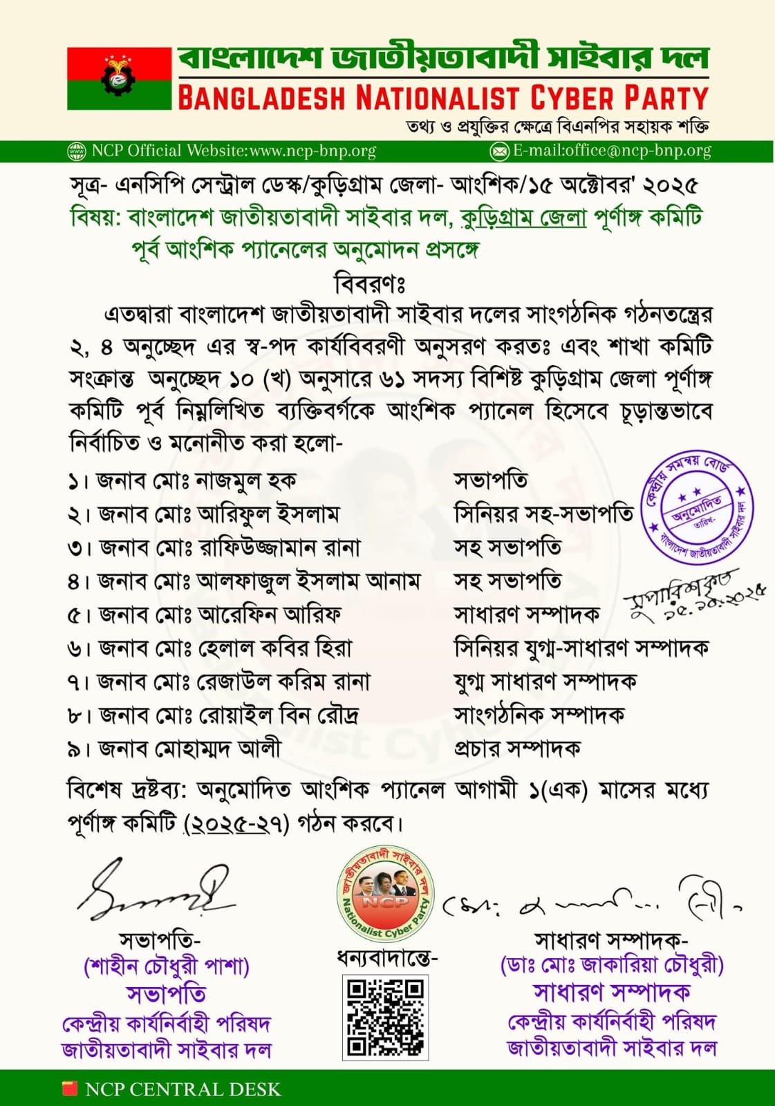 বাংলাদেশ জাতীয়তাবাদী সাইবার দলের সাংগঠনিক গঠনতন্ত্রের ২ ও ৪ অনুচ্ছেদ এবং শাখা কমিটি সংক্রান্ত ১০(খ) ধারা অনুসারে কুড়িগ্রাম জেলা পূর্ণাঙ্গ কমিটি গঠনের লক্ষ্যে কেন্দ্রীয় কার্যনির্বাহী পরিষদ ৬১ সদস্য বিশিষ্ট একটি আংশিক প্যানেল অনুমোদন করেছে ।