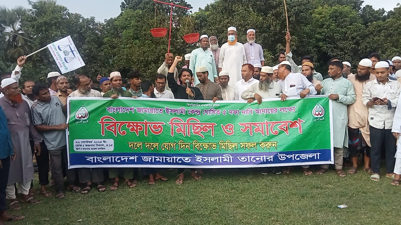 তানোর উপজেলায় জামায়াতে ইসলামীর কেন্দ্র ঘোষিত পাঁচ দফা দাবি নিয়ে এক বিরাট বিক্ষোভ মিছিল ও সমাবেশ। রাজশাহী জেলাধিন তানোর উপজেলায় বাংলাদেশ জামায়াত ইসলামির শাখার পক্ষ থেকে তানোর উপজেলা মডেল মসজিদ থেকে শুরু করে বিক্ষোভ মিছিল শুরু হয়,তানোর টু রাজশাহী প্রধান সড়ক থানার মোড় হয়ে গলাপাড়া বাজার সংলগ্ন মাঠে উক্ত মিছিলটি শেষ হয়। উক্ত সমাবেশে উপস্থিত ছিলেন শিবির নেতা আব্দুল মমিন,আরো উপস্থিত ছিলেন শ্রমিক কল্যাণ ফেডারেশন রাজশাহী জেলা সভাপতি মাওলানা মোঃ জামিলুর রহমান উপস্থিত ছিলেন ওলামা বিভাগ রাজশাহী জেলা সভাপতি মাওলানা মোঃ সিরাজুল ইসলাম। উপস্থিত ছিলেন তানোর উপজেলা আমির মাওলানা মোঃ আলমগীর হোসেন সহ আরও অন্যান্য নেতৃবৃন্দ।