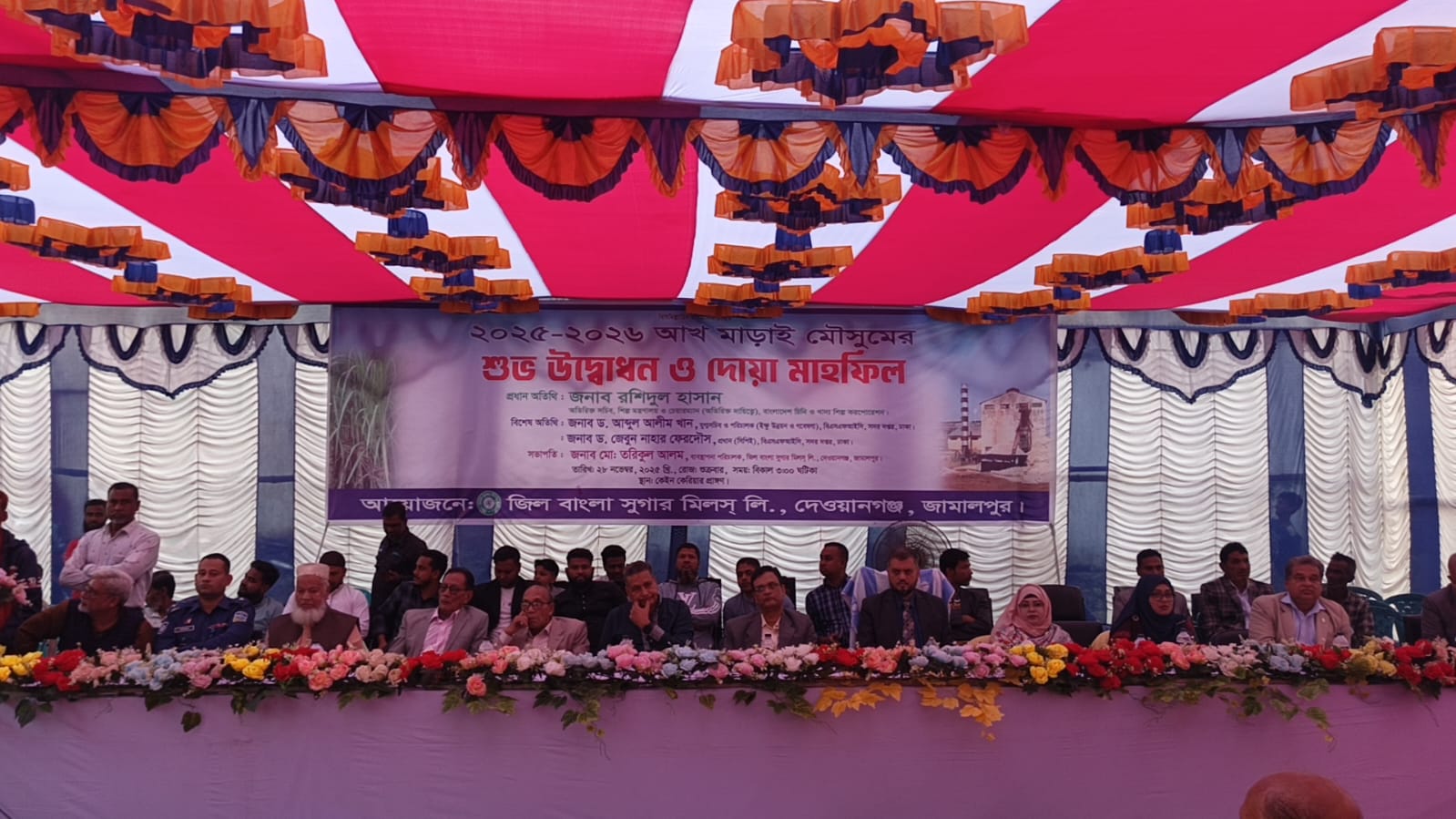 জামালপুরের দেওয়ানগঞ্জ উপজেলার ঐতিহ্যবাহী রাষ্ট্রায়ত্ত প্রতিষ্ঠান জিল বাংলা সুগার মিলস্–এ অনুষ্ঠিত হলো বহুল প্রত্যাশিত ৬৮তম আখ মাড়াই মৌসুমের শুভ উদ্বোধন ও দোয়া মাহফিল। শুক্রবার (২৮ নভেম্বর) বিকেলে মিলের কেইন কেরিয়ার প্রাঙ্গণে আয়োজিত এ অনুষ্ঠানে মিল এলাকার চাষি, কর্মকর্তা-কর্মচারী, স্থানীয় রাজনৈতিক ব্যক্তিত্বসহ নানা শ্রেণি-পেশার মানুষের অংশগ্রহণে মিল প্রাঙ্গণ উৎসবমুখর পরিবেশে পরিণত হয়।