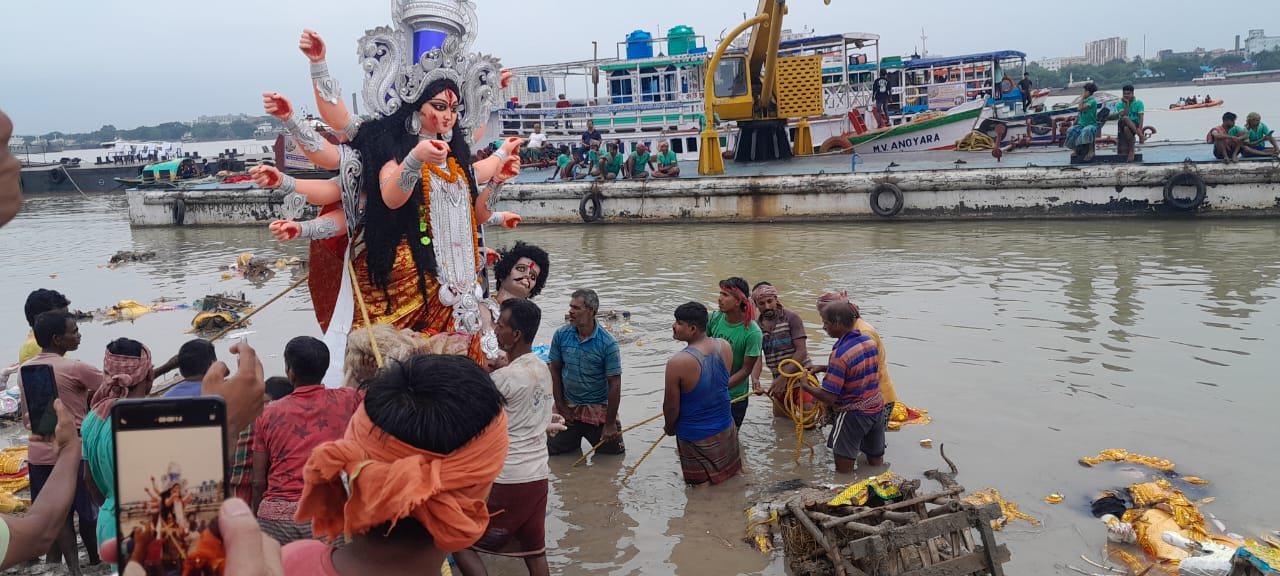 মাননীয় মুখ্যমন্ত্রী মমতা বন্দ্যোপাধ্যায় নির্দেশ দিয়েছেন রবিবারের মধ্যে সমস্ত প্রতিমা ফেলে দিতে হবে।, এই মতো ক্লাব উদ্যোক্তারা প্রতিমা নিয়ে সারিবদ্ধভাবে ঘাটে ভিড় জমিয়েছেন, আবার কেউ কেউ প্রতিমার সামনে বাজনার সাথে তাল মিলিয়ে নাচছেন আর বলছেন বলো দুর্গা মাইকি,