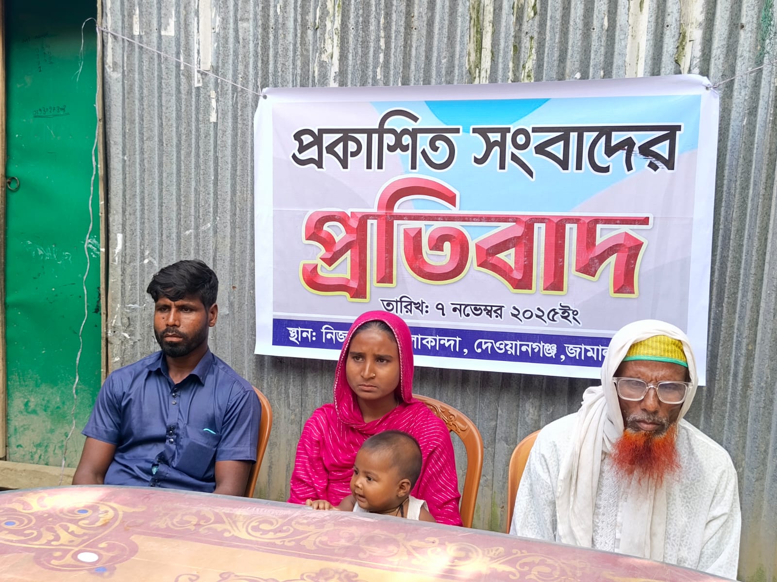 প্রকাশিত সংবাদের প্রতিবাদে আজ শুক্রবার (০৭ নভেম্বর ২০২৫) নিজ বাড়িতে সংবাদ সম্মেলন করেছেন জামালপুর জেলার দেওয়ানগঞ্জ উপজেলার পাররামরামপুর ইউনিয়নের কলাকান্দা নতুন গ্রামের এক ভুক্তভোগী পরিবার। তারা অভিযোগ করেছেন, সম্প্রতি ডাকাতির একটি ঘটনায় তাদের নাম উদ্দেশ্যমূলকভাবে জড়িয়ে ভিত্তিহীন সংবাদ প্রকাশ করা হয়েছে।
