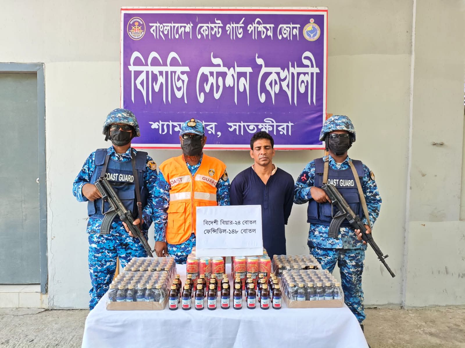 কোস্ট গার্ড সদর দপ্তর থেকে প্রাপ্ত তথ্য অনুযায়ী, গোপন সংবাদের ভিত্তিতে কোস্ট গার্ড স্টেশন কৈখালী আজ সকাল ৯টায় শ্যামনগর থানাধীন সাহেবখালী এলাকায় একটি বিশেষ অভিযান পরিচালনা করে। অভিযান চলাকালীন সন্দেহভাজন এক ব্যক্তিকে তল্লাশি করে তার কাছ থেকে অবৈধ মাদকদ্রব্য উদ্ধার করা হয়।ফেন্সিডিল ১৪৮ পিস,