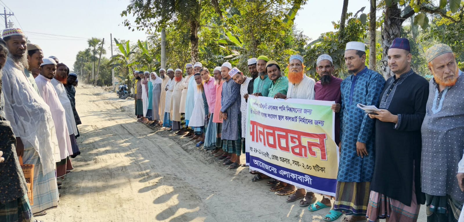 হীমখালী খালের সংযোগ স্থলে কালভার্ট নির্মানের জন্য এলাকাবাসীর পক্ষ থেকে মানব বন্ধনের আয়োজন করা হয়। ২৮ শে নভেম্বর ( শুক্রবার) দুপুর ২.৩০ টায় তারানীপুর - ভেটখালী জামে মসজিদ সংলগ্নে উক্ত মানব বন্ধন অনুষ্ঠিত হয়। মানব বন্ধনে উপস্থিত থেকে বক্তব্য রাখেন জি,এম, মুত্তালিব হোসেন , আলহাজ্ব আব্দুল মাজেদ, মোঃ সফিকুল ইসলাম, গাজী খালিদ সাইফুল্লাহ, মোঃ আব্দুল আজিজ, মোঃ মাহতাব হোসেন, মোঃ নূরুজ্জামান। মানব বন্ধনে উপস্থিত এলাকাবাসী বলেন , প্রতি বছর বর্ষা মৌসুমে আমরা প্লাবিত হয়। পানি নিষ্কাষনের সু-বন্দোবস্ত না থাকায় আমাদের চলাচলের রাস্তা , ধান্য ফসলের মাঠ , বসত ভিটা, পুকর পানিতে তলিয়ে যায়। বর্তমানে সড়ক ও জনপদ বিভাগের রাস্তার কাজ চলমান। রাস্তা সংস্কারের পাশাপাশি কালভার্টটি নির্মান করা আশু প্রয়োজন। কালভার্টটি নির্মাণ হলে খালের পানি দিয়ে বিভিন্ন প্রকার ফসল উৎপাদন করা যাবে। তারা আরও বলেন, কালভার্ট নির্মানের বিষয়ে এলাকাবাসীর পক্ষ থেকে জেলা প্রশাসক , সড়ক ও জনপদ বিভাগের প্রকৌশলী ও উপজেলা নির্বাহী অফিসারের নিকট লিখিত আবেদন দেওয়া হয়। কর্তৃপক্ষ সরজমিনে এসে মাপ জরিপ করার পরে আর কোন পদক্ষেপ গ্রহন করেননি। তারানীপুর-ভেটখালী এলাকার পানি নিষ্কাষনের জন্য ঝুড়ঝুড়ি-হীমখালী খালের সংযোগ স্থলে কালভার্ট নির্মানের জন্য সংশ্লিষ্ট কর্তৃপক্ষের জরুরী হস্তক্ষেপ কামনা করছেন এলাকাবাসী। মানব বন্ধন অনুষ্টানটি পরিচালনা করেন রমজাননগর দারুস সুন্নাহ আদর্শ দাখিল মাদ্রাসার শিক্ষক মোঃ মশিউর রহমান।