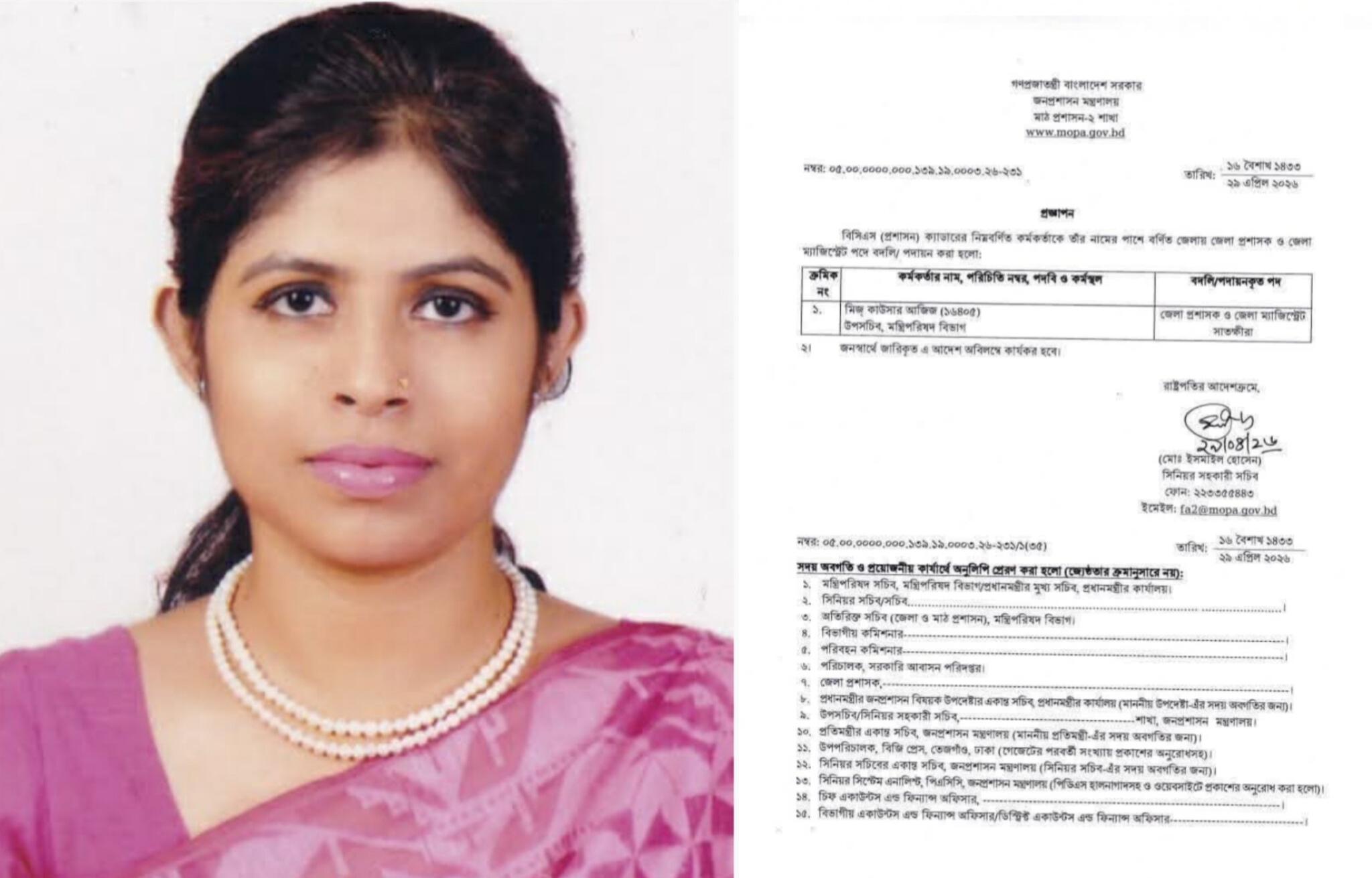 সংশ্লিষ্ট মন্ত্রণালয় সূত্রে জানা গেছে, দাপ্তরিক প্রক্রিয়া সম্পন্ন করে শীঘ্রই তিনি সাতক্ষীরা জেলায় যোগদান করে আনুষ্ঠানিকভাবে দায়িত্ব গ্রহণ করবেন।