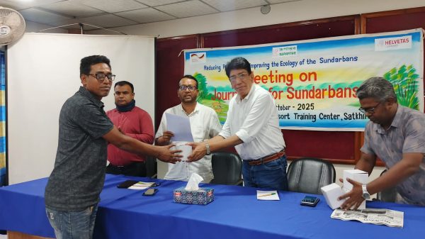 পলিথিনমুক্ত সুন্দরবনের পক্ষে প্রতিবেদন: রূপান্তর-এর পরিচালকের হাত থেকে পুরস্কার গ্রহণ করলেন সাংবাদিক আব্দুল হালিম।