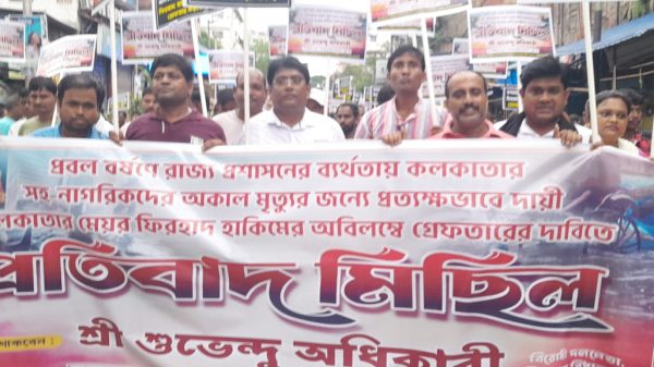 কলকাতা পৌরসভা ও রাজ্য প্রশাসনের গাফিলতিতে, বর্ষায় বিদ্যুৎপৃষ্ট হয়ে ১২ জনের মৃত্যু ঘটায়- প্রতিবাদ মিছিল।